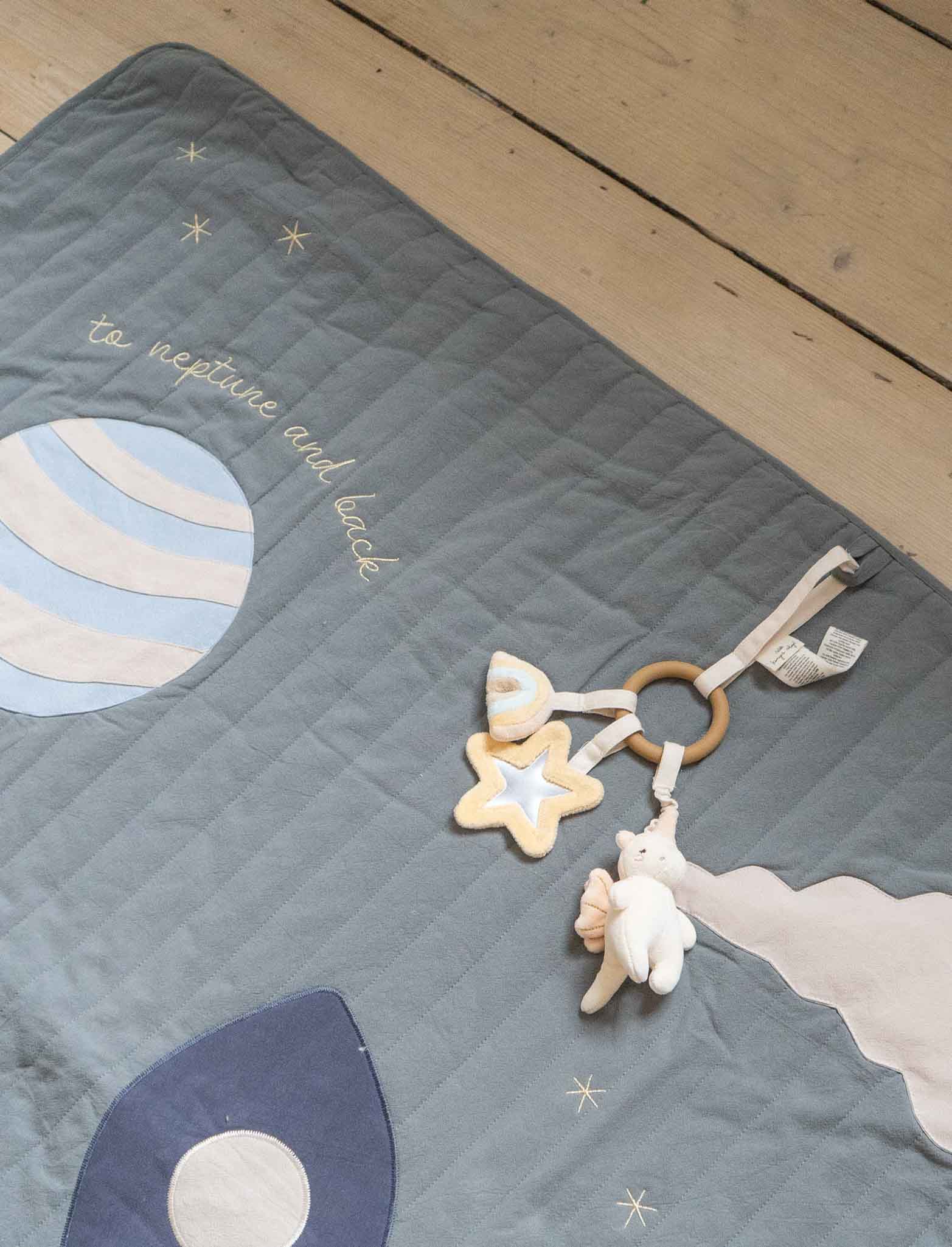 Our great "Space" play blanket is made from 100 percent organic cotton and has various stimulation functions. The shapes, sounds and different materials promote your baby's sensory development. The blanket also has small rings on the side to which you can attach your own baby toys.